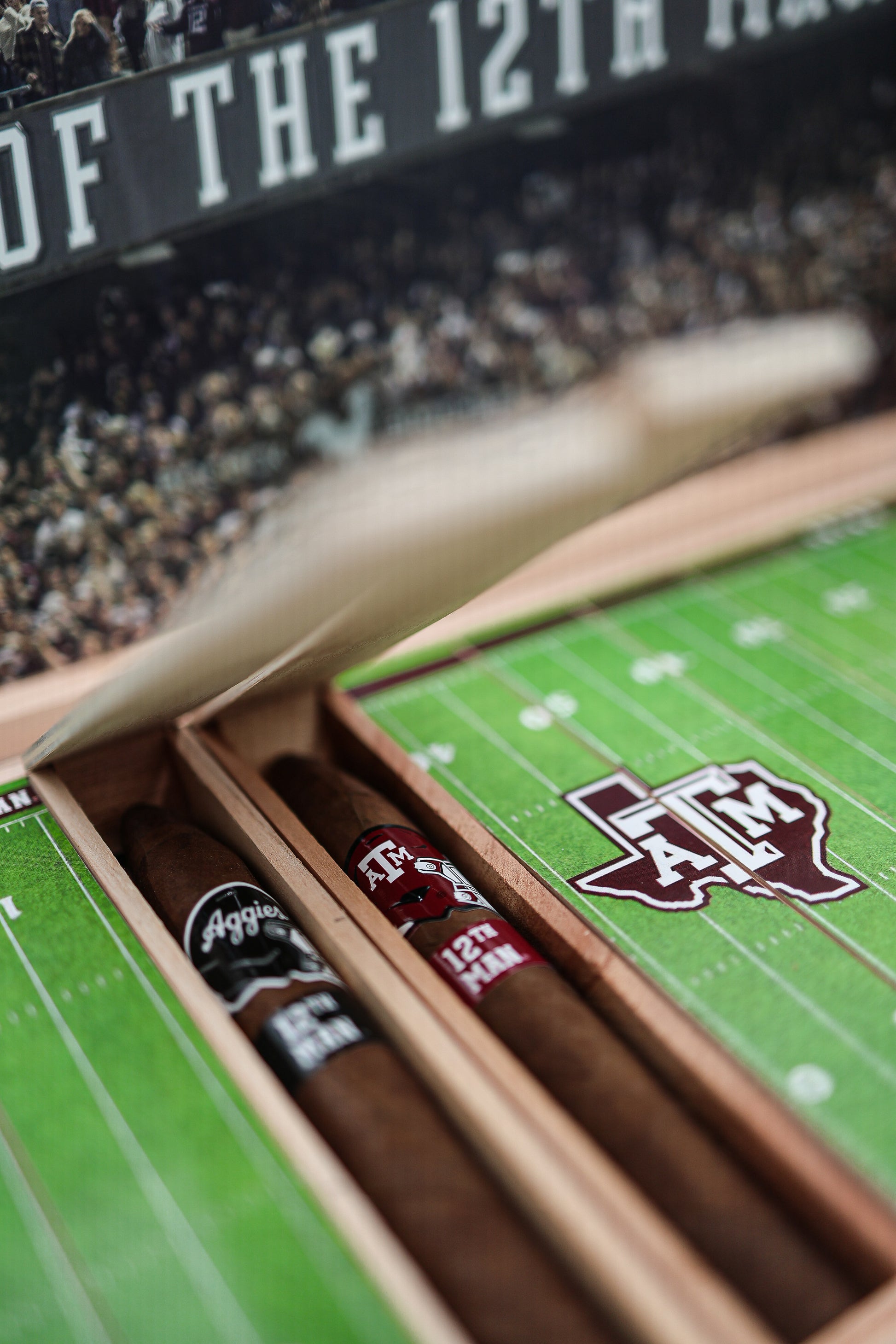 Made in honor of the 12th Man — whether you're lighting up after a hard-fought win, gifting it to a fellow former student, or saving it for life’s biggest moments, the 12th Man Reserve was built to stand tall with a box that is a generational display piece. The box itself encases each of the 12 cigars individually that, when they are side-by-side, display our sacred Kyle Field.